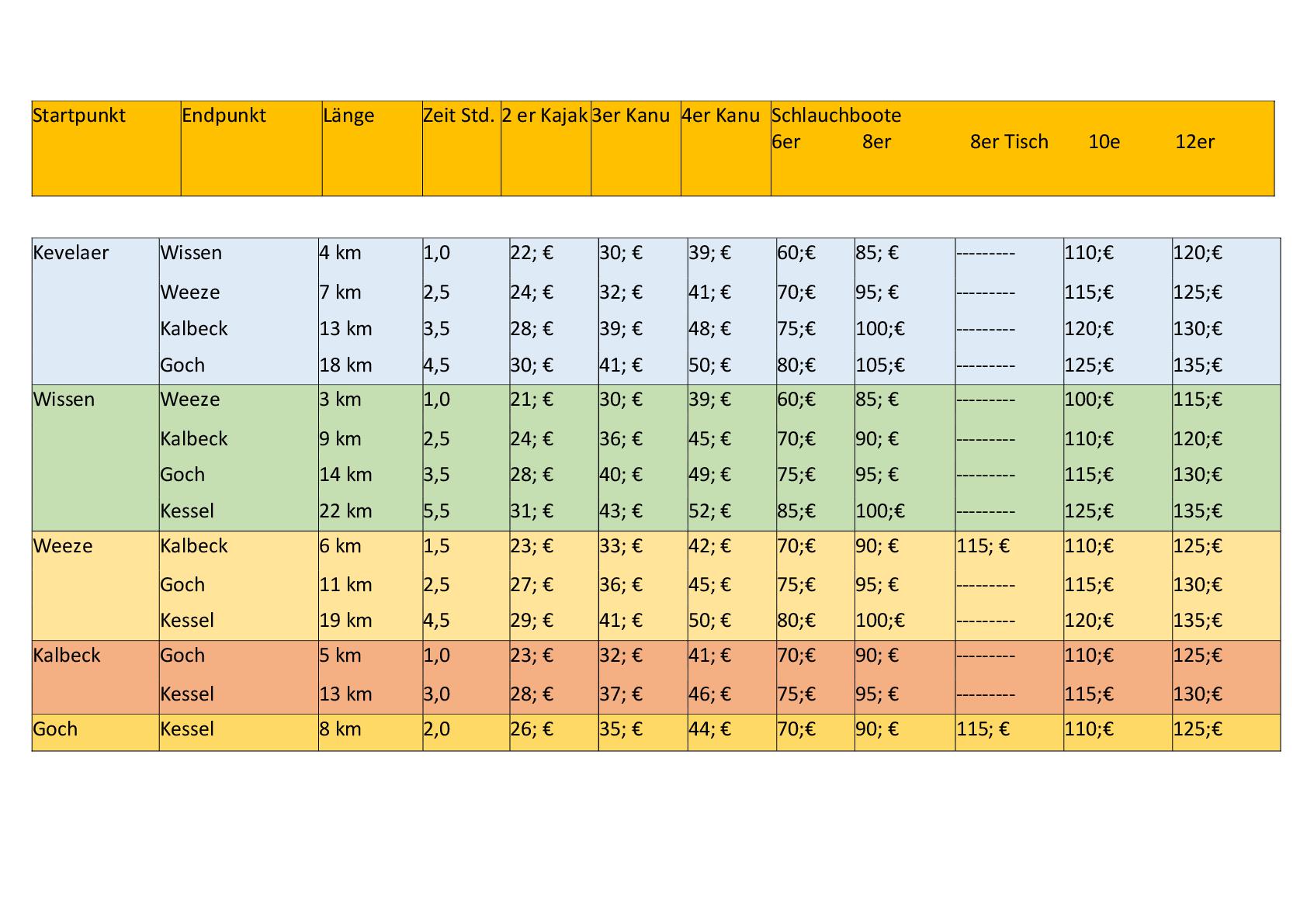 Die aufgeführten Tourvorschläge sind vom Abfahrtsort aus sortiert, die genannten Fahrzeiten sind abhängig vom Wasserstand der Niers, sowie ihrem persönlich Paddeleinsatz.